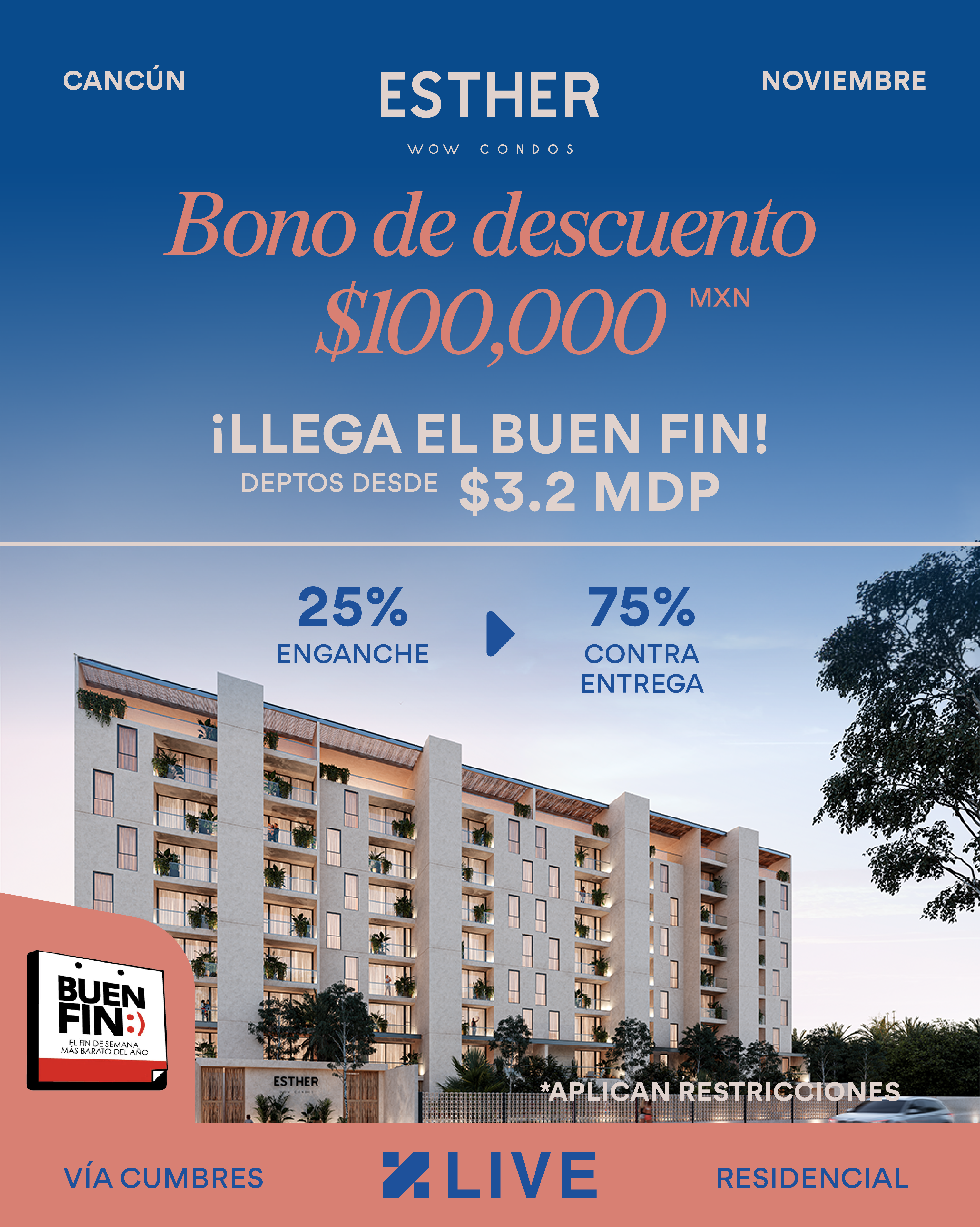 Esther Wow Condos es un desarrollo residencial de lujo con vistas panorámicas y acabados de primera calidad, ubicado en Vía Cumbres, una de las zonas de mayor plusvalía de Cancún.